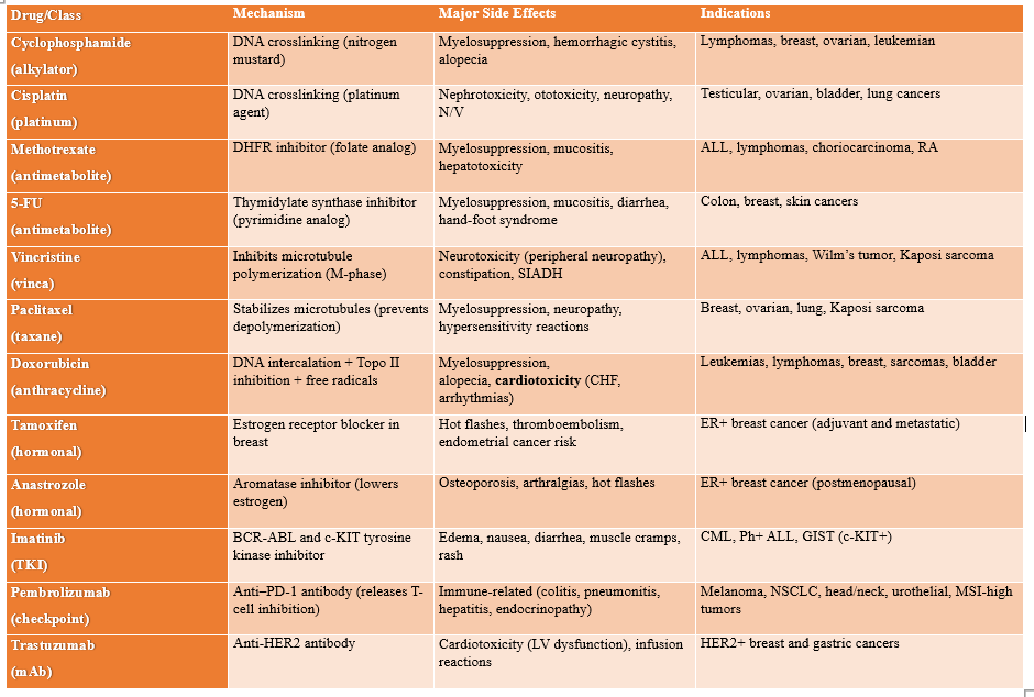 Indications vary by drug and target; e.g., cisplatin is key for testicular and ovarian cancer, methotrexate for leukemias/lymphomas, trastuzumab for HER2+ breast cancer, pembrolizumab for melanoma and other PD-L1–expressing tumors. The table above provides a concise comparison of agents, mechanisms, toxicities, and uses.