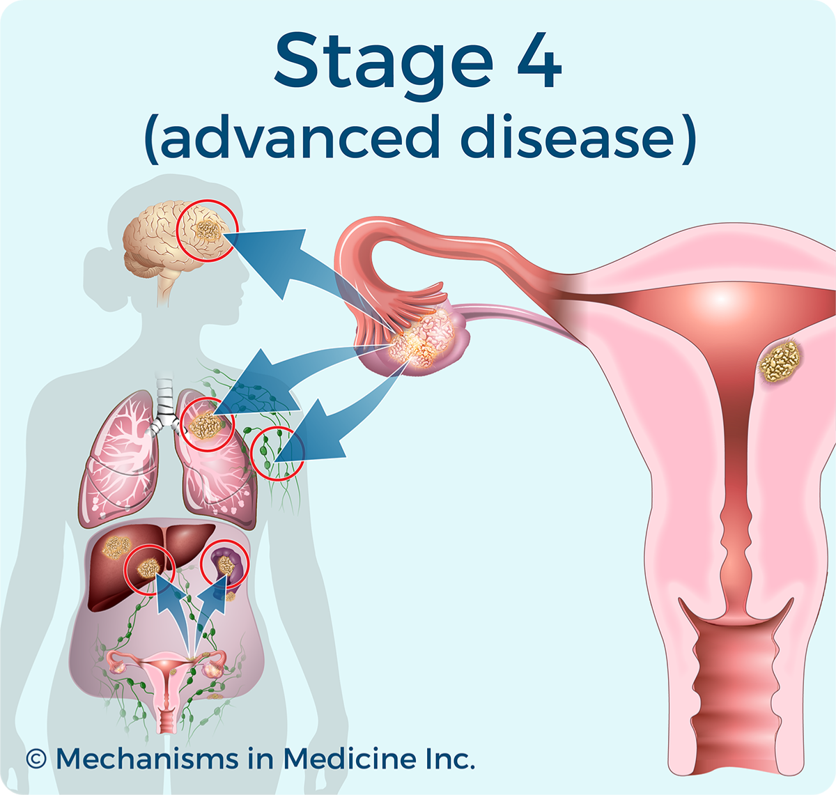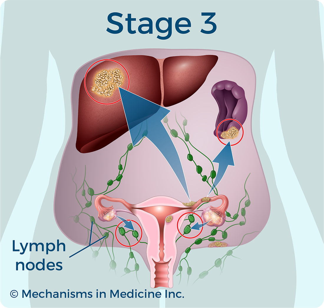 For example, the diagram above contrasts stage III vs stage IV disease. In stage III, cancer has already spread beyond the ovaries to nearby abdominal organs or lymph nodes15. By stage IV, it has reached distant sites such as the liver, lungs or other organs16.