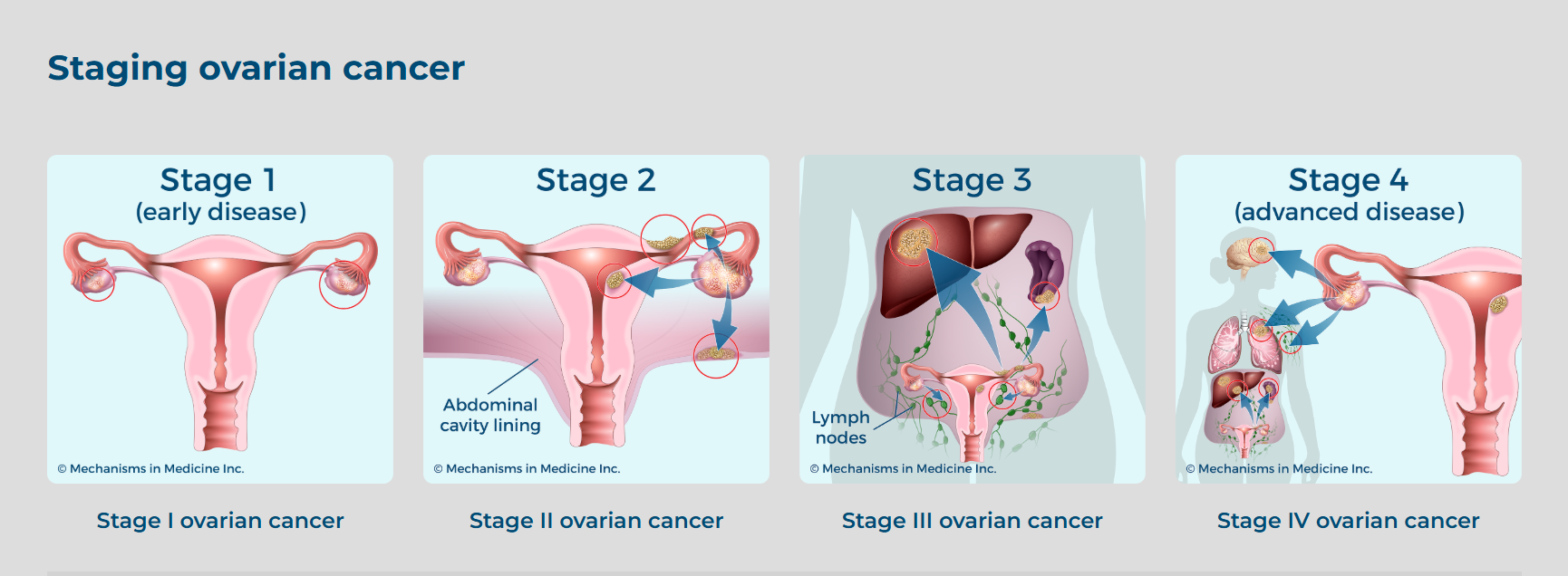 Ovarian cancer is staged using the FIGO system (similar to AJCC TNM), with stages I–IV based on extent of spread29.